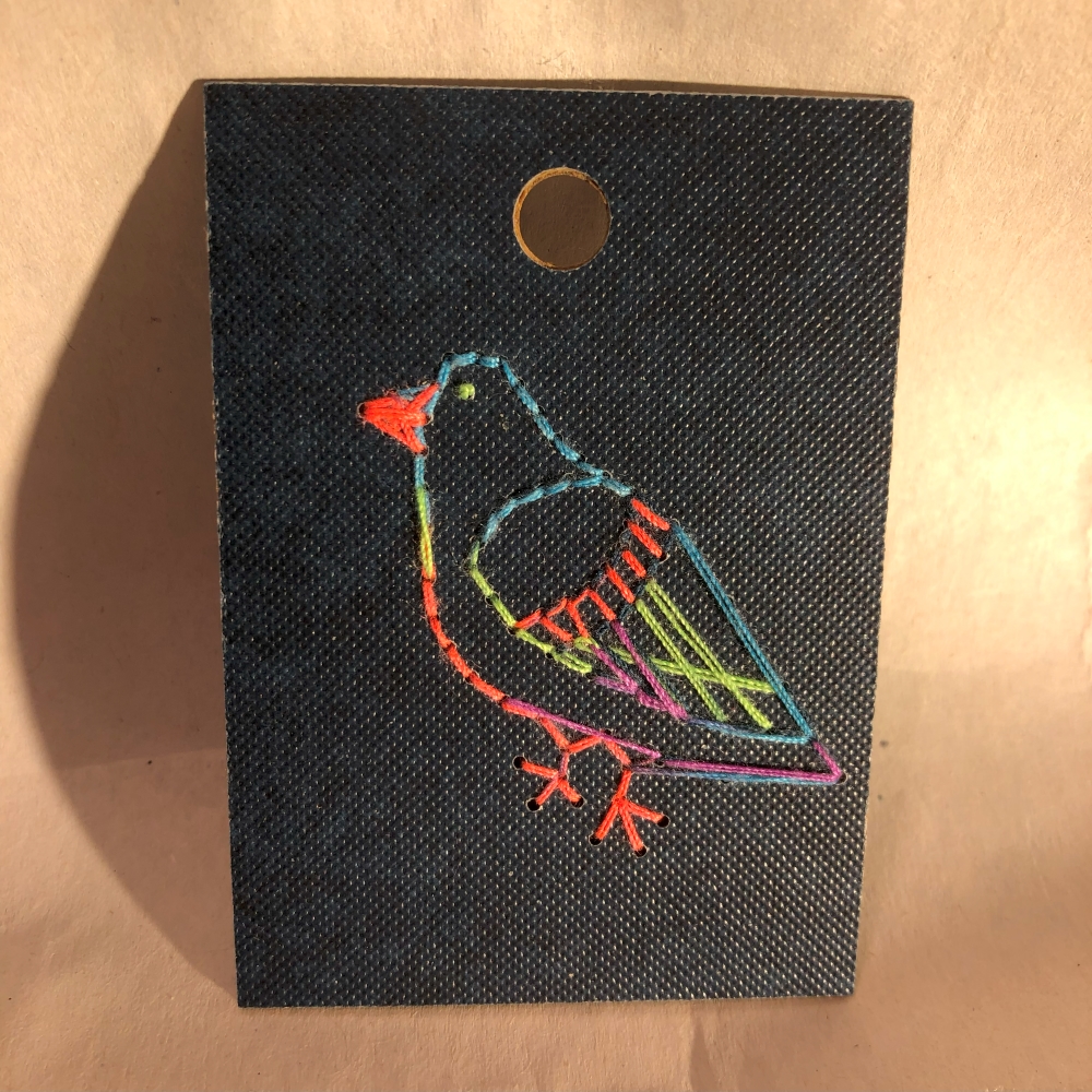 Small tile at 2 x 2.5 inches with a hole for hanging or stringing.