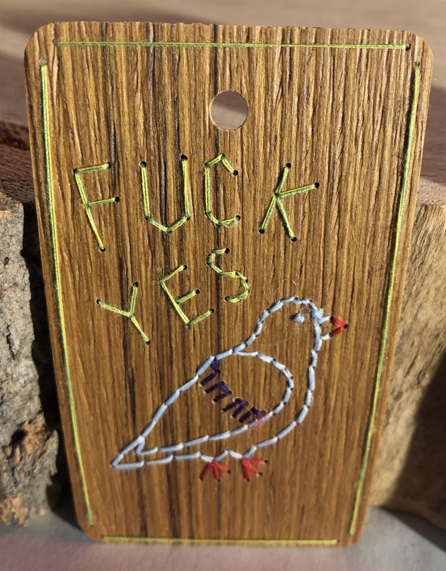 Expressive tile 2 x 3.5 inches with a hole for hanging or stringing.