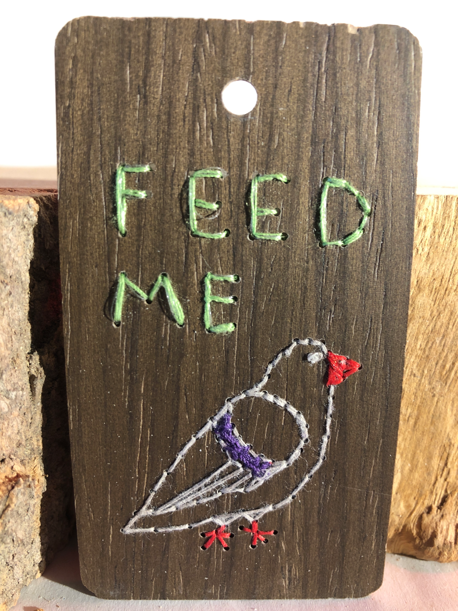 Expressive tile 2 x 3.5 inches with a hole for hanging or stringing.