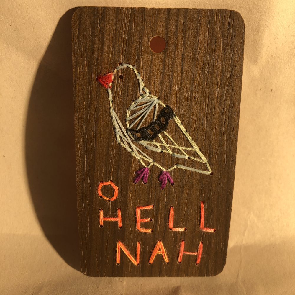 Expressive tile 2 x 3.5 inches with a hole for hanging or stringing.