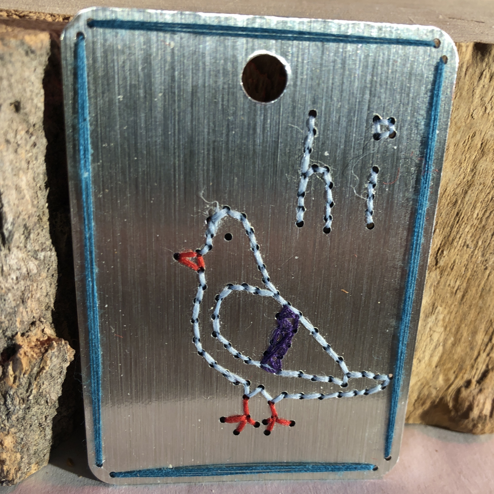 Small tile at 2 x 2.5 inches with a hole for hanging or stringing.