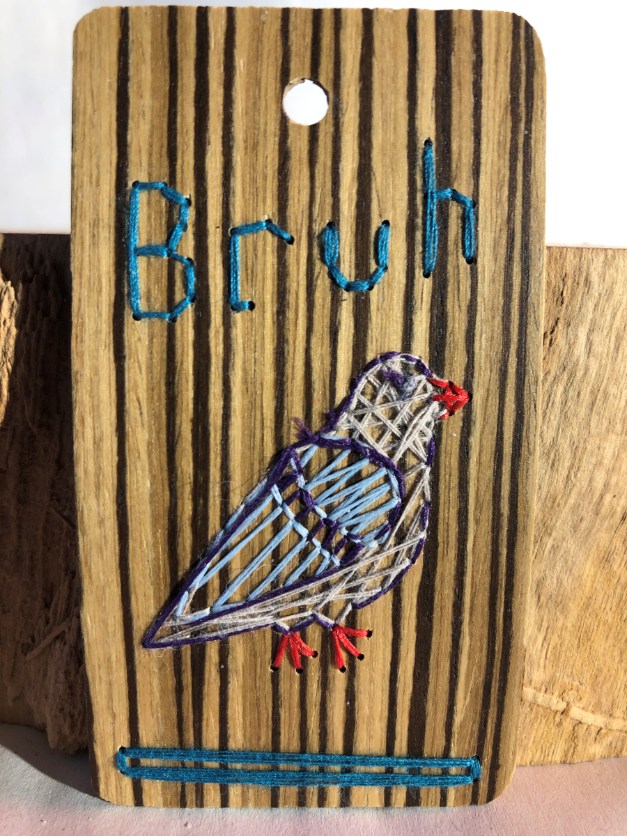 Expressive tile 2 x 3.5 inches with a hole for hanging or stringing.
